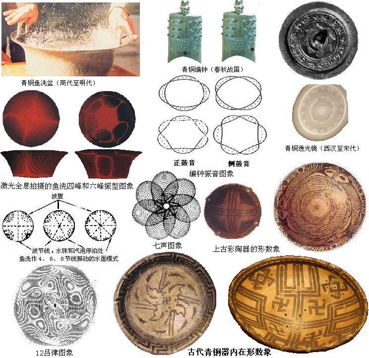 彩陶上的圖象和圖形,展現(xiàn)了上古文明的陳跡,是上文明的結(jié)晶,古埃及是幾何圖形見長,中國上古除了簡單幾何圖形,更多是形數(shù)象。五千年前,文字的發(fā)明,同時青銅器開始出現(xiàn)。中國中古夏代是由陶器向青銅器過渡的時期,殷商能鑄造精美的金器和青銅器。金屬所制的器物比粘土燒制的陶器更具活力,振動聲播、熱導(dǎo)電傳,比陶器優(yōu)越得多,好比近代的機(jī)械的熱動性、近現(xiàn)代電氣的電動性,現(xiàn)代電子的信息性,技術(shù)不斷更新。中古的青銅器治金和鑄造技術(shù),沒有現(xiàn)代技術(shù)先進(jìn),但青銅器一此特殊功能,卻令現(xiàn)代人嘆為觀止,難以模仿。青銅器關(guān)鍵是內(nèi)在的器構(gòu),不是外部形體結(jié)構(gòu)。商代為青銅器發(fā)展的頂盛時期,其鑄造技術(shù)一直延續(xù)至明代的近代機(jī)械鐵器鑄造興起才失傳。要問中國古代科技成就,眾人熟知的活字印刷、造紙、火藥、指南針的四大發(fā)明,這些都是小科技。中國古代高端科技是供人玩樂的中華青銅三大寶,魚洗盆、編鐘、透光鏡,其深藏科學(xué)的大道理。如圖〖古代青銅器內(nèi)在形數(shù)象〗所示,經(jīng)激光全息拍攝,青銅器內(nèi)在振動圖象,正是上古彩陶上的形數(shù)象,摩擦叩擊,洪鐘音樂,透光鏡正面采光,背現(xiàn)影像。中華青銅三大寶展示了中國古代科技工藝,采用了高超的系統(tǒng)數(shù)理,八卦符只是系統(tǒng)工具,形數(shù)象才是系統(tǒng)數(shù)理核心。