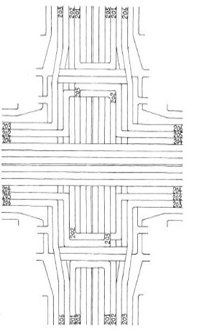開(kāi)放型人行道115進(jìn)入路口前讓位于電動(dòng)車道。縱向電動(dòng)車道301人行道302位于兩端路面橋上的橫向掉頭車道與縱向高架車道的中間,兩端分別穿越右轉(zhuǎn)彎車道(高度以電動(dòng)車行人順利通過(guò)為宜)。人行道出入口107、108跨越電動(dòng)車道,人行道出入口107-108之間(橫向)為地下通道穿越各縱向車道(高度以電動(dòng)車行人順利通過(guò)為宜)。電動(dòng)車道出入口109-110之間(橫向)為地下通道,穿越人行道入口107、108和各縱向車道(高度以電動(dòng)車行人順利通過(guò)為宜)。