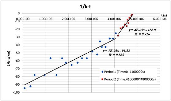 于是, 通過密集地在曲線上取點然后通過Excel軟件錄入并處理其t和 h坐標(biāo), 我們可以近似得到曲線在相應(yīng)點上的切線斜率k. 進一步地, 通過建立k和1/t之間的線性回歸模型, 我們可以解決出A和B. 并通過求估計高度與實際高度的差的平均值, 我們可以得C. 綜上我們可以得到以下的密度-高度模型: