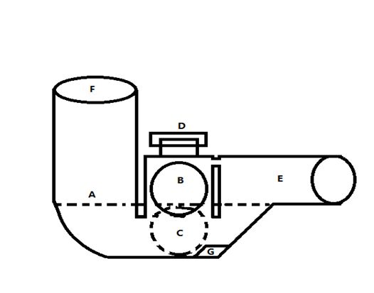 排水管的設(shè)計(如圖):本設(shè)計是在U型管道的基礎(chǔ)上增加固體阻斷機構(gòu)(球形、圓柱形等多種形體),當U型管道中填充一定量的水時,機構(gòu)內(nèi)的阻斷球就會在浮力的作用下,處于完全開放的狀態(tài),當U型管道內(nèi)的水因得不到及時補充而氣化,這時,B球體在重力作用下,隨著管內(nèi)水位下降而下落。在管道底部、球體下落方向增設(shè)斜面,增加球體下落壓力,增加球體密封效果。當管道內(nèi)補充一定的水量時,球體的水的浮力作用下,上浮到B區(qū),保持管道通暢。從而達到有效阻止有害物質(zhì)回流的目的。