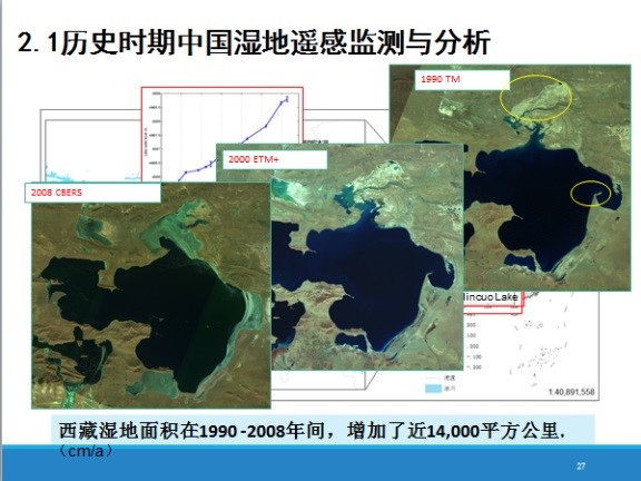 如圖所示,我們用了GLAS數(shù)據(jù),測試高層數(shù)據(jù)反應了水面高層,反應湖水容納變化。這是青藏高原的輪廓,冰川融水非常的多,原來納木錯是最大的,現(xiàn)在色林錯最大,20年前西藏濕地增加1萬多平方公里。