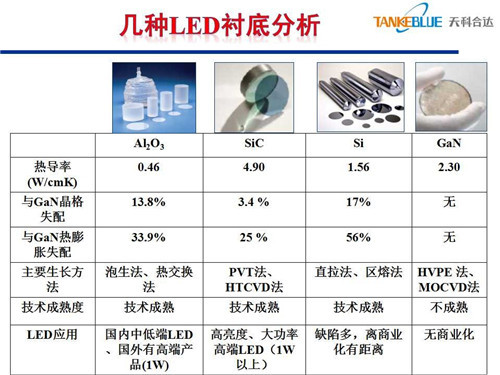 但是在這里面我們今天講的主要是藍寶石、碳化硅,剛才在講的時候我思考幾個問題,這幾個材料在發(fā)光效率上藍寶石可以做到150lm/W,碳化硅可以做到200lm/W,在發(fā)光效率上確實體現差異。在物理基礎參數上體現了差異,比如說跟氮化鎵外延,從晶格匹配上,碳化硅上長氮化鎵確實好一些,藍寶石失配大一些,直接影響外延的質量。另外導電性、熱導率也是有差異的。