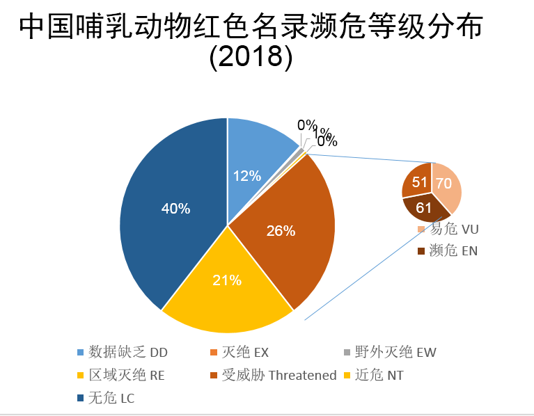 此外,我們對(duì)中國(guó)哺乳動(dòng)物多樣性進(jìn)行編目,分別于2015年和2017年完成了第一版和第二版,第一版中,我們收錄了673種哺乳動(dòng)物,第二版中我們刪除了一些不存在的物種如倭巖羊,并增添了一些物種,主要是分布在藏南的一些物種,共收錄了693種哺乳動(dòng)物,使得我國(guó)的哺乳動(dòng)物總數(shù)位列全球首位。2015年發(fā)布《中國(guó)生物多樣性紅色名錄-脊椎動(dòng)物卷》后,2018年又對(duì)該紅色名錄等級(jí)進(jìn)行了更新,哺乳動(dòng)物的情況來(lái)看,最新的評(píng)估結(jié)果中,受威脅的物種占26%、近危21%,無(wú)危40%,數(shù)據(jù)缺乏12%,其中有多個(gè)物種已經(jīng)區(qū)域滅絕、野外滅絕或功能性滅絕。部分中國(guó)特有的哺乳動(dòng)物,中國(guó)生物多樣性紅色名錄和IUCN紅色名錄的評(píng)估結(jié)果,由于評(píng)估信息的不同,結(jié)果也有所不同,如白鱀豚、長(zhǎng)江江豚等;還有一些哺乳動(dòng)物由于并非中國(guó)特有,所以中國(guó)生物多樣性紅色名錄和IUCN紅色名錄評(píng)估等級(jí)有所不同,如野馬、賽加羚羊、麋鹿、蒙原羚、河貍等。