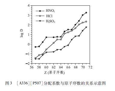 [A336 ] [ P507]對稀土離子的萃取趨勢是隨著原子系數(shù)增加分配系數(shù)增大,如圖3所示。不同酸性條件下的相對分配系數(shù)關(guān)系順序:HN03 > HCl >H2SO4,與酸根離子的水化能ΔG順序一致,硝酸根的水化能最低(ΔGO=-314kJ/mol),硫酸根水化能最高(ΔGO =-1103 kJ/mol )。