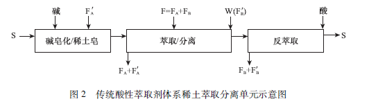 傳統(tǒng)酸性萃取劑體系稀土萃取分離流程,每一個分離單元的工藝如圖2所示,萃取劑有機相S需要用堿皂化,萃取難萃稀土A制取負載難萃稀土有機相,進人分離段交換萃取分離對象(A和B)中的易萃稀土B以獲得純稀土A水相,隨后用純易萃稀土B洗滌萃取劑有機相中的難萃稀土A以獲得負載純易萃稀土B的有機相,最后用酸反萃取使B轉(zhuǎn)型至水相,萃取劑有機相得到再生循環(huán)使用。
