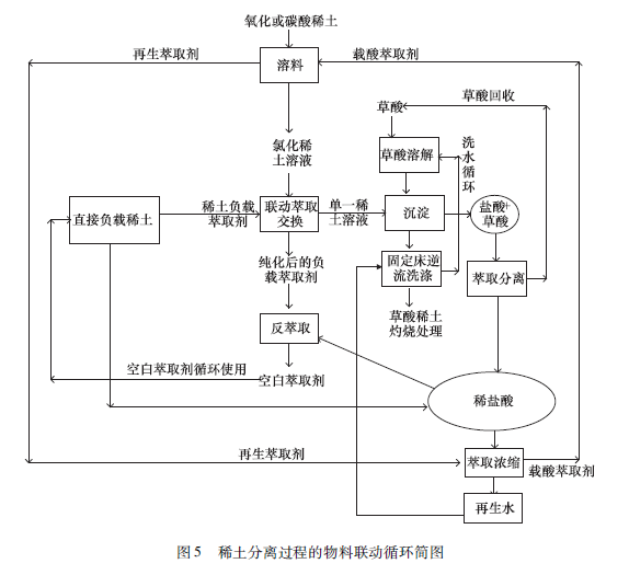 聯(lián)動萃取工藝雖然能大幅度減低分離的酸堿消耗和鹽的排放,但也不能徹底不用酸堿,消除鹽排放。我們可以從聯(lián)動萃取工藝思想拓展到萃取分離物料聯(lián)動循環(huán)達成綠色分離概念。從分離過程各個階段的反應(yīng)方程可以看到:稀土原料溶解所需要的鹽酸與稀土草酸沉淀產(chǎn)生的鹽酸是對應(yīng)的仁反應(yīng)(1)和反應(yīng)(7)酸性萃取劑萃取稀土置換出來的鹽酸與洗滌和反萃取所需的鹽酸是匹配的仁反應(yīng)(3)和反應(yīng)(6);在保證萃取效率的情況下,皂化過程仁反應(yīng)(4)」可以取消。理想狀態(tài)下,原料溶解、萃取分離,稀土沉淀洗滌等過程都能進行物料聯(lián)動循環(huán)利用。分離過程可用方程(8)表示,只需要消耗等當(dāng)量的草酸: