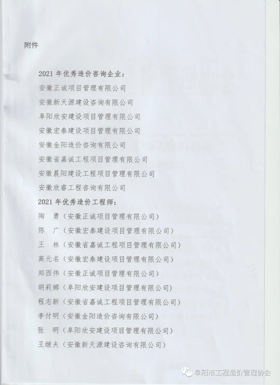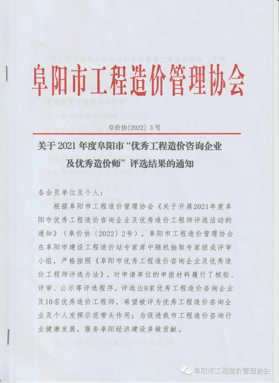 關(guān)于2021年度阜陽市“優(yōu)秀工程造價咨詢企業(yè)及優(yōu)秀造價師”評選結(jié)果的通知 作者: 安徽新天源建設咨詢有限公司 最后修訂: 2022-07-06 10:23:18 摘要: