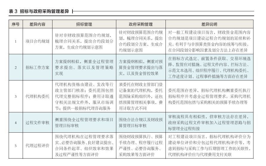 工程建設(shè)項(xiàng)目招標(biāo)管理是指站在建設(shè)全過(guò)程視角對(duì)招標(biāo)活動(dòng)實(shí)施的一系列管理工作。同理,政府采購(gòu)管理指采購(gòu)人針對(duì)擬組織實(shí)施的采購(gòu)活動(dòng)開(kāi)展的一系列管理工作。政府采購(gòu)管理過(guò)程除遵循財(cái)政預(yù)算控制要求外,依然需將全過(guò)程思想貫穿始終。上述兩類活動(dòng)管理目標(biāo)均包括降低過(guò)程風(fēng)險(xiǎn)、提升交易效率、確保交易質(zhì)量、滿足全過(guò)程管理要求等。招投標(biāo)或政府采購(gòu)管理工作內(nèi)容均包括:合約規(guī)劃、工作方案編制、代理機(jī)構(gòu)委托、過(guò)程文件審核、招標(biāo)與采購(gòu)代理過(guò)程評(píng)價(jià)等方面。針對(duì)上述內(nèi)容,兩類活動(dòng)有關(guān)差異內(nèi)容詳見(jiàn)表3。